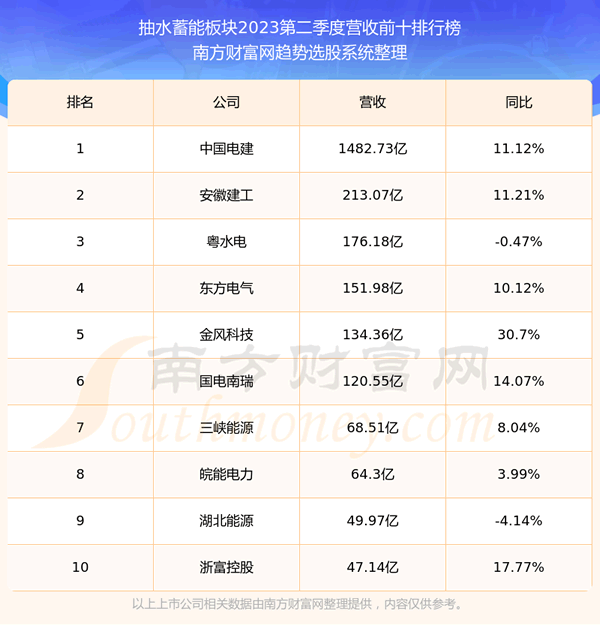 按照趋势选股系统统计,该股所属板块为抽水蓄能板块,该板块共有32只股票,南网储能2023第二季度营收在该板块中排名为第21名,该板块2023第二季度营收排名前十的股票如下表: