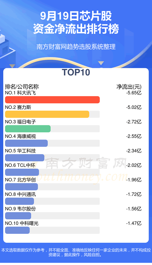 芯片股9月19日资金净流出情况来看,科大讯飞位列第一位,主力净流出达到-5.65亿元;赛力斯排名第二,主力净流出为-5.02亿元;福日电子排名第三,主力净流出-2.72亿元。主力净流出排名前10的还有:海康威视、华工科技、TCL中环、北方华创、中兴通讯、韦尔股份、中科曙光。