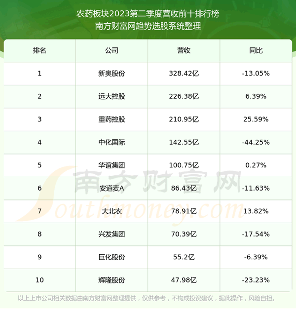 按照趋势选股系统统计,该股所属板块为农药板块,该板块共有84只股票,广信股份2023第二季度营收在该板块中排名为第24名,该板块2023第二季度营收排名前十的股票如下表: