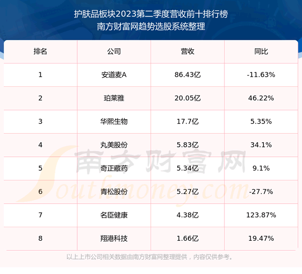 按照趋势选股系统统计,该股所属板块为护肤品板块,该板块共有8只股票,华熙生物2023第二季度营收在该板块中排名为第3名,该板块2023第二季度营收排名前十的股票如下表: