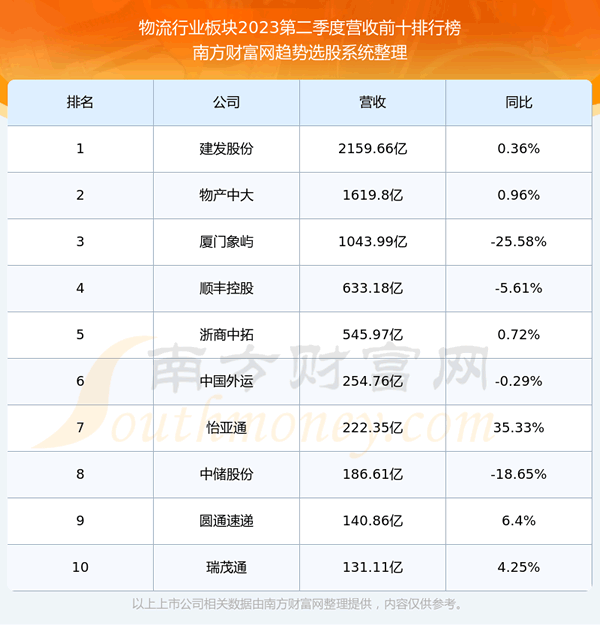 按照趋势选股系统统计,该股所属板块为物流行业板块,该板块共有57只股票,广深铁路2023第二季度营收在该板块中排名为第57名,该板块2023第二季度营收排名前十的股票如下表: