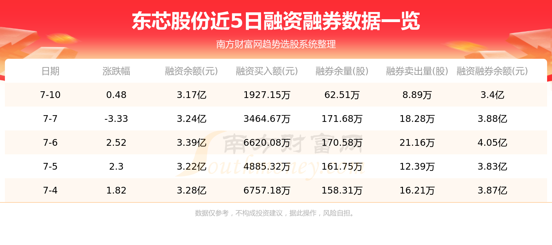 东芯股份7月10日融券信息显示,融资方面,当日融资买入1927.15万元,融资偿还2647.18万元,融资净买额-720.04万元。融券方面,融券卖出8.89万股,融券偿还118.06万股,融券余量62.51万股,融券余额2349.86万元。融资融券余额3.4亿元。近5日融资融券数据一览见下表: