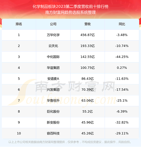 按照趋势选股系统统计,该股所属板块为化学制品板块,该板块共有133只股票,东方材料2023第二季度营收在该板块中排名为第123名,该板块2023第二季度营收排名前十的股票如下表: