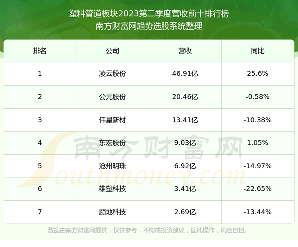 按照趋势选股系统统计,该股所属板块为塑料管道板块,该板块共有7只股票,凌云股份2023第二季度营收在该板块中排名为第1名,该板块2023第二季度营收排名前十的股票如下表: