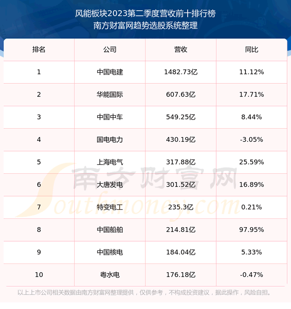 按照趋势选股系统统计,该股所属板块为风能板块,该板块共有191只股票,节能风电2023第二季度营收在该板块中排名为第83名,该板块2023第二季度营收排名前十的股票如下表: