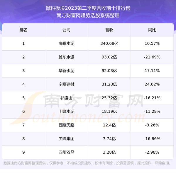 按照趋势选股系统统计,该股所属板块为骨料板块,该板块共有9只股票,华新水泥2023第二季度营收在该板块中排名为第3名,该板块2023第二季度营收排名前十的股票如下表: