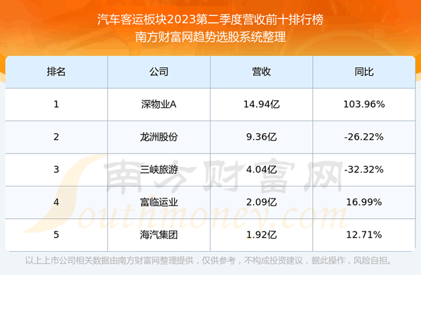 按照趋势选股系统统计,该股所属板块为汽车客运板块,该板块共有5只股票,海汽集团2023第二季度营收在该板块中排名为第5名,该板块2023第二季度营收排名前十的股票如下表:
