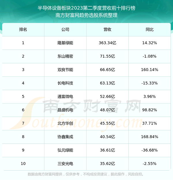 按照趋势选股系统统计,该股所属板块为半导体设备板块,该板块共有112只股票,芯源微2023第二季度营收在该板块中排名为第59名,该板块2023第二季度营收排名前十的股票如下表:
