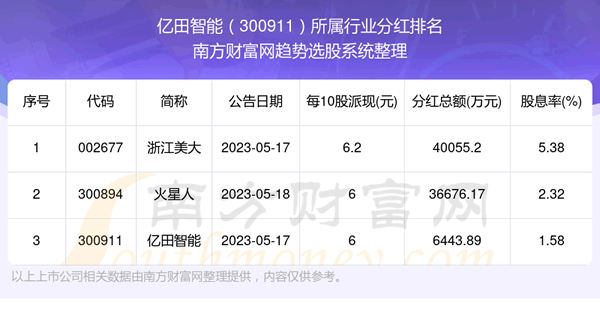 按照趋势选股系统统计,亿田智能所属行业为集成灶行业,集成灶行业分红排名情况如下表: