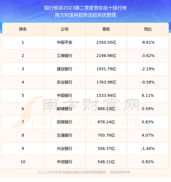 按照趋势选股系统统计,该股所属板块为银行板块,该板块共有44只股票,苏农银行2023第二季度营收在该板块中排名为第42名,该板块2023第二季度营收排名前十的股票如下表: