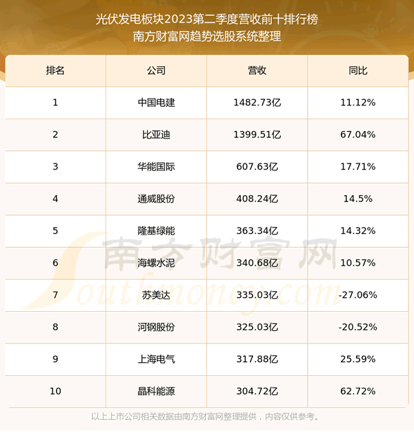 按照趋势选股系统统计,该股所属板块为光伏发电板块,该板块共有248只股票,芯能科技2023第二季度营收在该板块中排名为第225名,该板块2023第二季度营收排名前十的股票如下表: