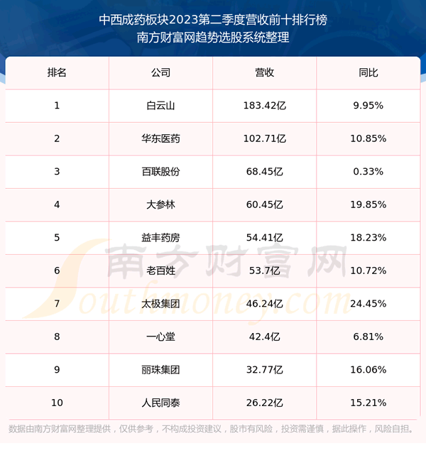 按照趋势选股系统统计,该股所属板块为中西成药板块,该板块共有14只股票,大参林2023第二季度营收在该板块中排名为第4名,该板块2023第二季度营收排名前十的股票如下表: