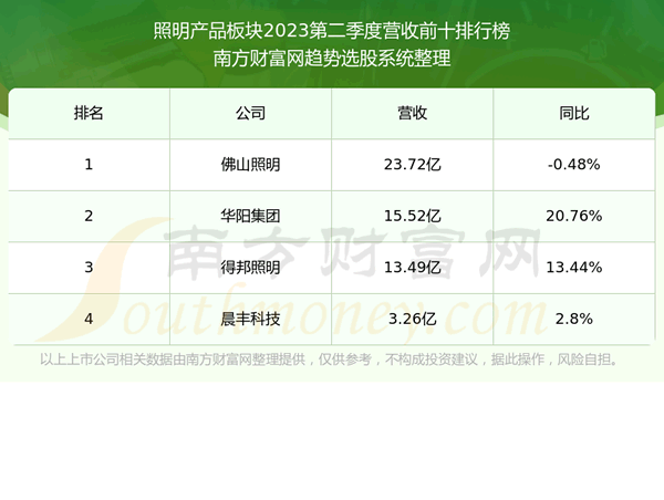 按照趋势选股系统统计,该股所属板块为照明产品板块,该板块共有4只股票,晨丰科技2023第二季度营收在该板块中排名为第4名,该板块2023第二季度营收排名前十的股票如下表: