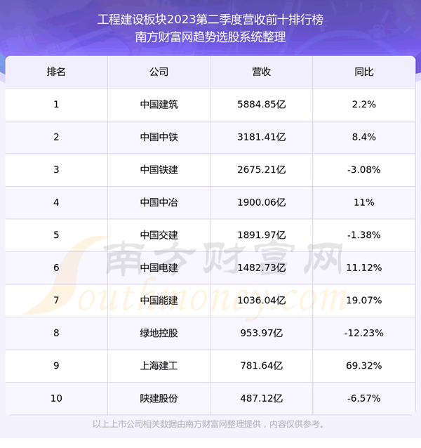 按照趋势选股系统统计,该股所属板块为工程建设板块,该板块共有126只股票,中国化学2023第二季度营收在该板块中排名为第11名,该板块2023第二季度营收排名前十的股票如下表: