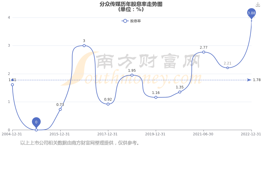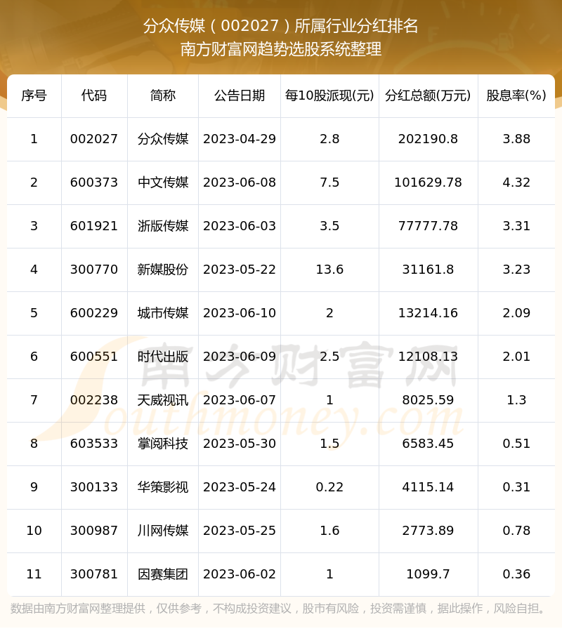 按照趋势选股系统统计,分众传媒所属行业为文化传媒行业,文化传媒行业分红排名情况如下表: