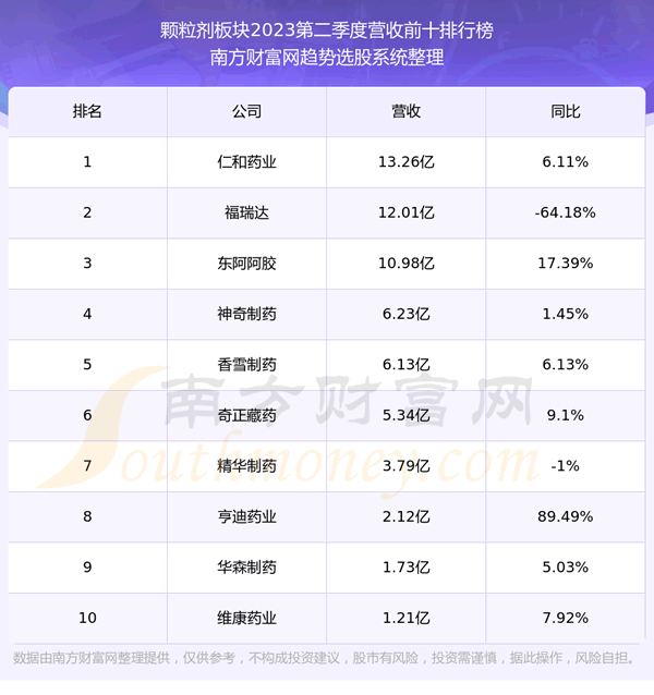 按照趋势选股系统统计,该股所属板块为颗粒剂板块,该板块共有11只股票,康缘药业2023第二季度营收在该板块中排名为第11名,该板块2023第二季度营收排名前十的股票如下表: