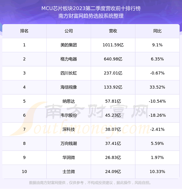 按照趋势选股系统统计,该股所属板块为MCU芯片板块,该板块共有45只股票,芯海科技2023第二季度营收在该板块中排名为第42名,该板块2023第二季度营收排名前十的股票如下表: