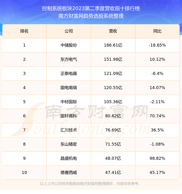 按照趋势选股系统统计,该股所属板块为控制系统板块,该板块共有153只股票,双元科技2023第二季度营收在该板块中排名为第153名,该板块2023第二季度营收排名前十的股票如下表: