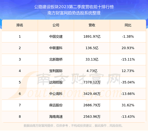 按照趋势选股系统统计,该股所属板块为公路建设板块,该板块共有8只股票,交建股份2023第二季度营收在该板块中排名为第8名,该板块2023第二季度营收排名前十的股票如下表: