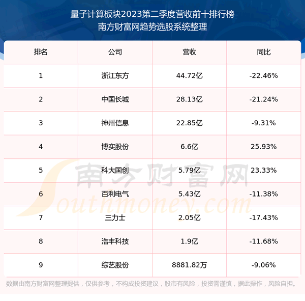 按照趋势选股系统统计,该股所属板块为量子计算板块,该板块共有9只股票,国盾量子2023第二季度营收在该板块中排名为第9名,该板块2023第二季度营收排名前十的股票如下表: