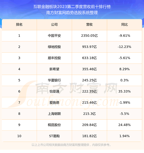 按照趋势选股系统统计,该股所属板块为互联金融板块,该板块共有191只股票,方正证券2023第二季度营收在该板块中排名为第42名,该板块2023第二季度营收排名前十的股票如下表:
