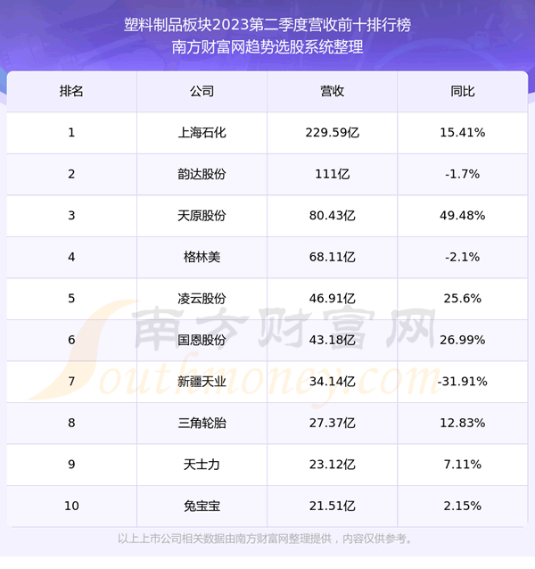 按照趋势选股系统统计,该股所属板块为塑料制品板块,该板块共有71只股票,*ST榕泰2023第二季度营收在该板块中排名为第71名,该板块2023第二季度营收排名前十的股票如下表: