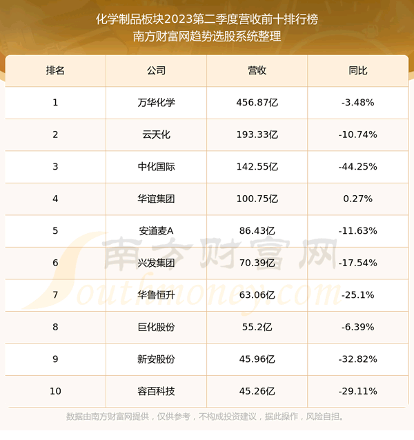 按照趋势选股系统统计,该股所属板块为化学制品板块,该板块共有133只股票,江瀚新材2023第二季度营收在该板块中排名为第63名,该板块2023第二季度营收排名前十的股票如下表: