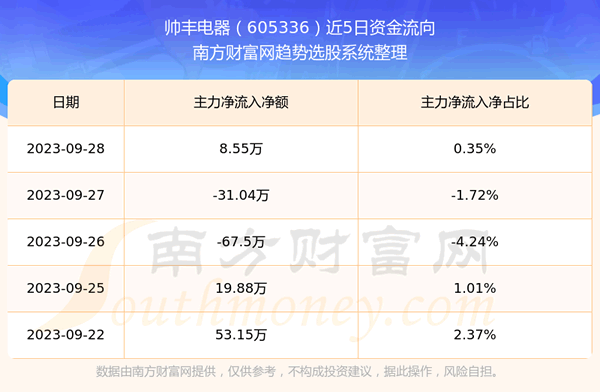 二、帅丰电器(605336)近期盘面、资金面情况