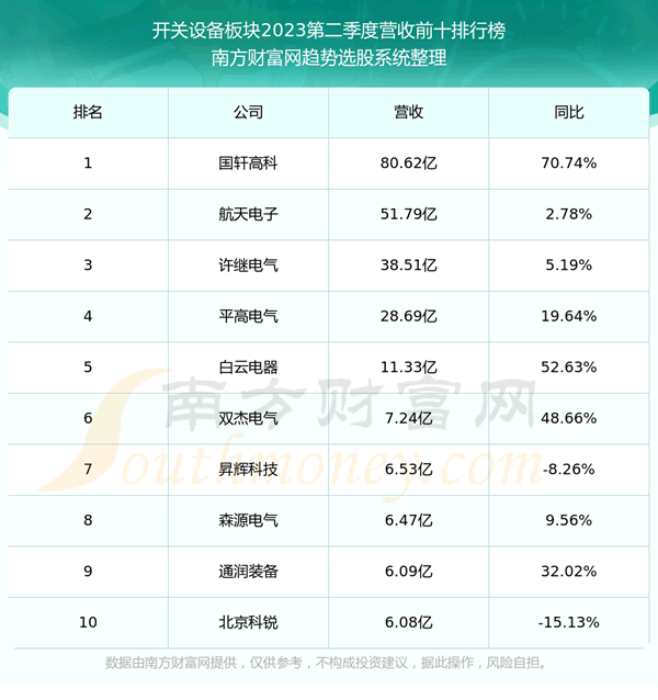 按照趋势选股系统统计,该股所属板块为开关设备板块,该板块共有24只股票,白云电器2023第二季度营收在该板块中排名为第5名,该板块2023第二季度营收排名前十的股票如下表:
