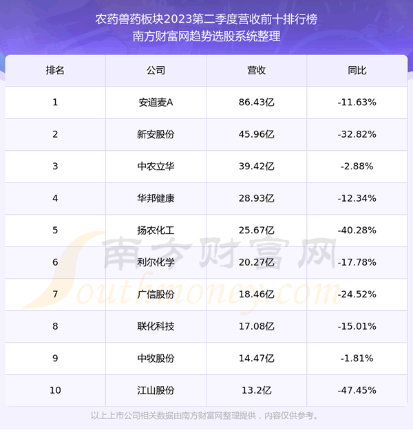 按照趋势选股系统统计,该股所属板块为农药兽药板块,该板块共有37只股票,百傲化学2023第二季度营收在该板块中排名为第37名,该板块2023第二季度营收排名前十的股票如下表: