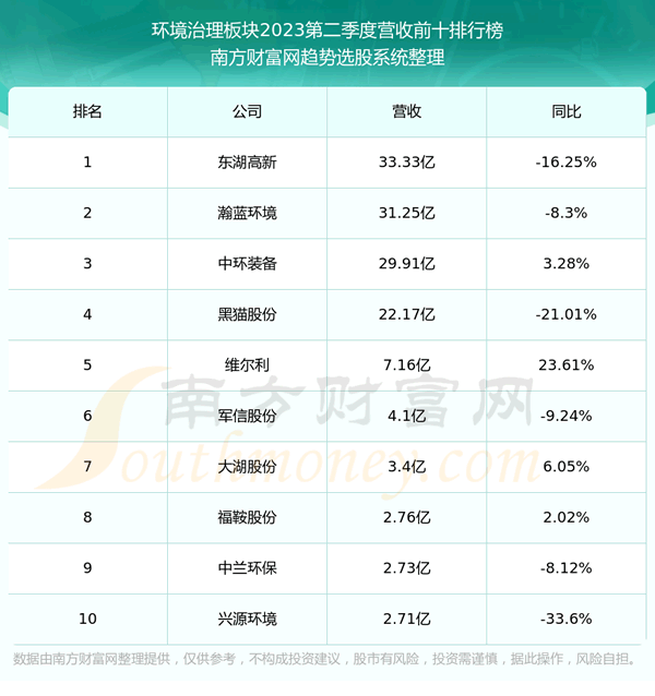 按照趋势选股系统统计,该股所属板块为环境治理板块,该板块共有17只股票,诚邦股份2023第二季度营收在该板块中排名为第17名,该板块2023第二季度营收排名前十的股票如下表: