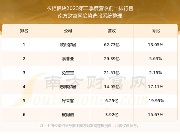 按照趋势选股系统统计,该股所属板块为衣柜板块,该板块共有6只股票,欧派家居2023第二季度营收在该板块中排名为第1名,该板块2023第二季度营收排名前十的股票如下表: