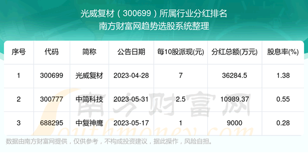 按照趋势选股系统统计,光威复材所属行业为碳纤维行业,碳纤维行业分红排名情况如下表: