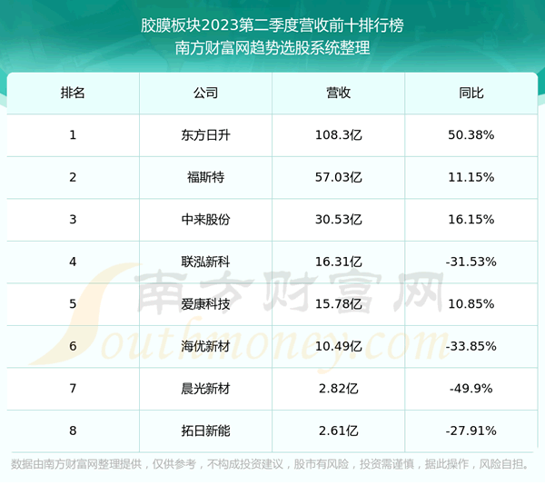 按照趋势选股系统统计,该股所属板块为胶膜板块,该板块共有8只股票,赛伍技术2023第二季度营收在该板块中排名为第8名,该板块2023第二季度营收排名前十的股票如下表: