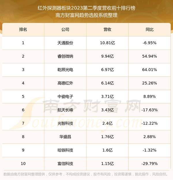 按照趋势选股系统统计,该股所属板块为红外探测器板块,该板块共有12只股票,睿创微纳2023第二季度营收在该板块中排名为第2名,该板块2023第二季度营收排名前十的股票如下表:
