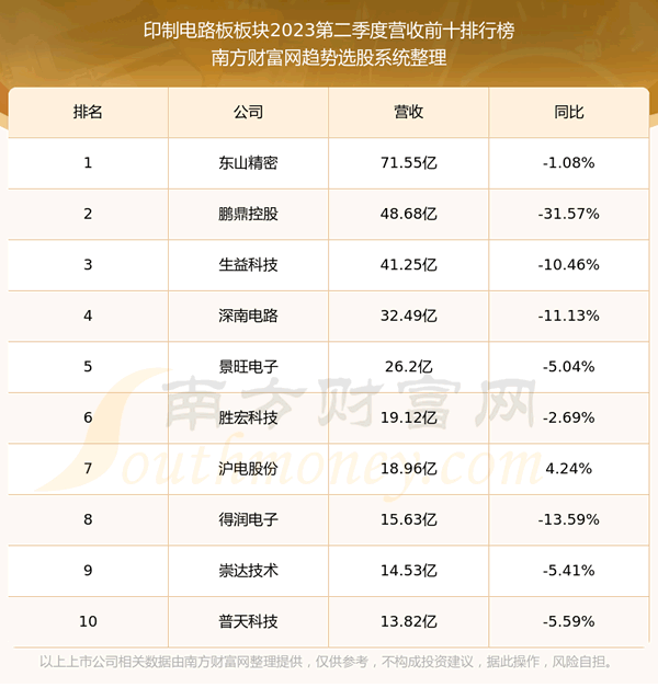 按照趋势选股系统统计,该股所属板块为印制电路板板块,该板块共有44只股票,生益电子2023第二季度营收在该板块中排名为第19名,该板块2023第二季度营收排名前十的股票如下表: