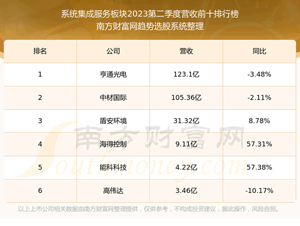 按照趋势选股系统统计,该股所属板块为系统集成服务板块,该板块共有6只股票,和达科技2023第二季度营收在该板块中排名为第6名,该板块2023第二季度营收排名前十的股票如下表: