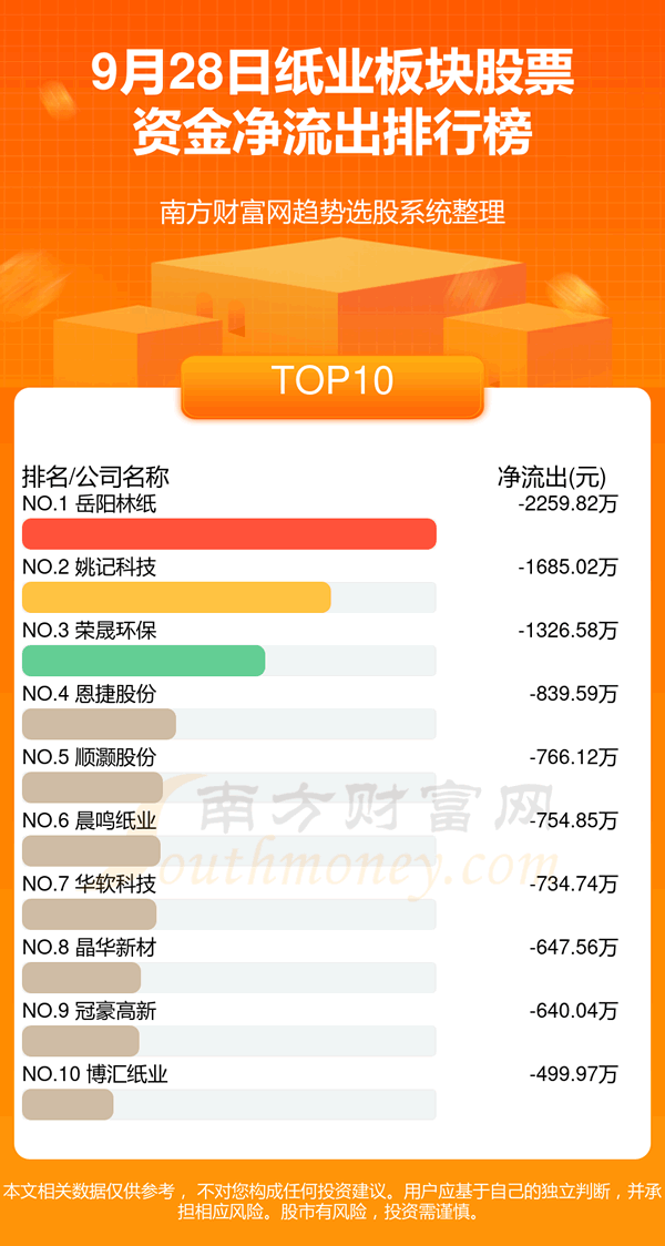 纸业板块股票9月28日资金净流出情况来看,岳阳林纸位列第一位,主力净流出达到-2259.82万元;姚记科技排名第二,主力净流出为-1685.02万元;荣晟环保排名第三,主力净流出-1326.58万元。主力净流出排名前10的还有:恩捷股份、顺灏股份、晨鸣纸业、华软科技、晶华新材、冠豪高新、博汇纸业。