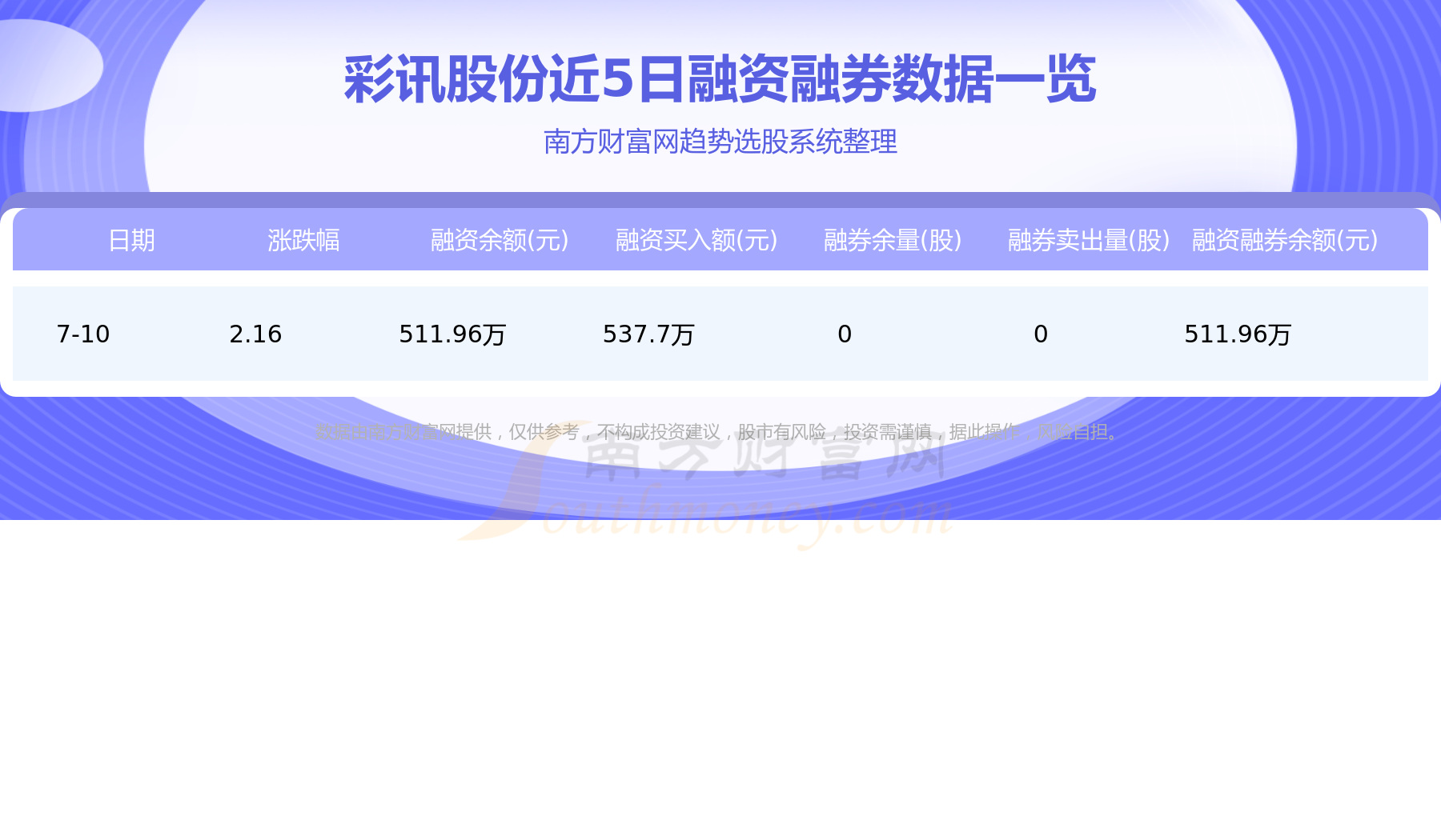 7月10日彩讯股份融券信息显示,近5日融资融券数据一览见下表: