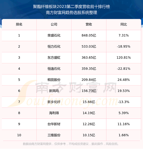 按照趋势选股系统统计,该股所属板块为聚酯纤维板块,该板块共有17只股票,三维股份2023第二季度营收在该板块中排名为第10名,该板块2023第二季度营收排名前十的股票如下表: