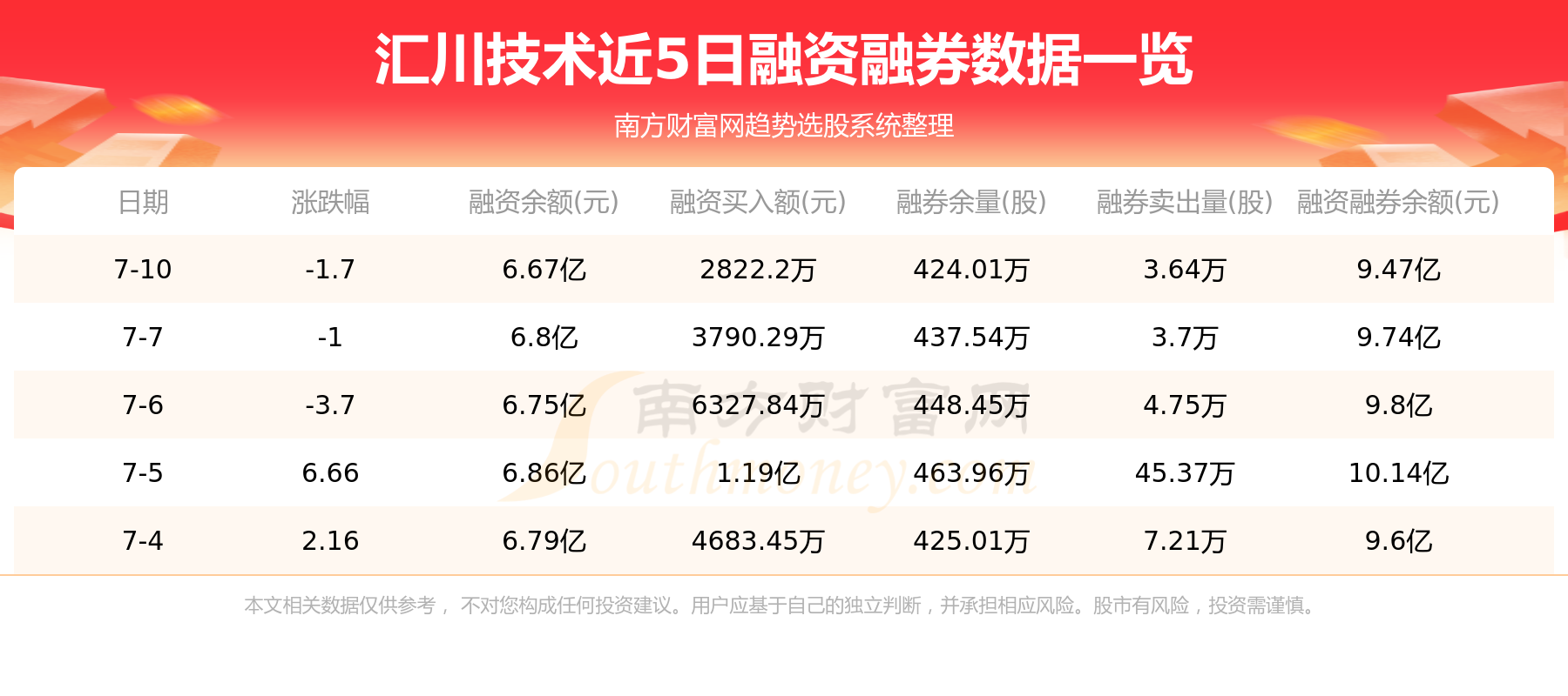 7月10日汇川技术融券信息显示,融资方面,当日融资买入2822.2万元,融资偿还4136.03万元,融资净买额-1313.83万元。融券方面,融券卖出3.64万股,融券偿还17.17万股,融券余量424.01万股,融券余额2.8亿元。融资融券余额9.47亿元。近5日融资融券数据一览见下表: