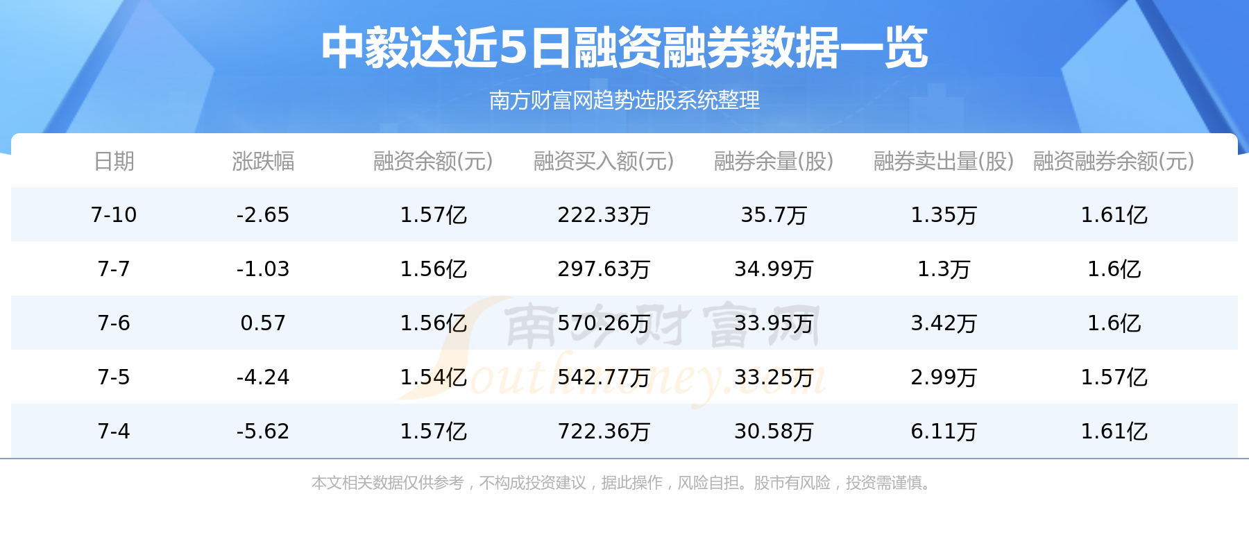 中毅达7月10日融券信息显示,融资方面,当日融资买入222.33万元,融资偿还117.64万元,融资净买额104.69万元。融券方面,融券卖出1.35万股,融券偿还6400股,融券余量35.7万股,融券余额367.36万元。融资融券余额1.61亿元。近5日融资融券数据一览见下表: