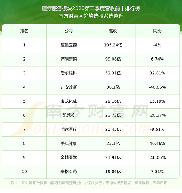按照趋势选股系统统计,该股所属板块为医疗服务板块,该板块共有67只股票,新华医疗2023第二季度营收在该板块中排名为第67名,该板块2023第二季度营收排名前十的股票如下表: