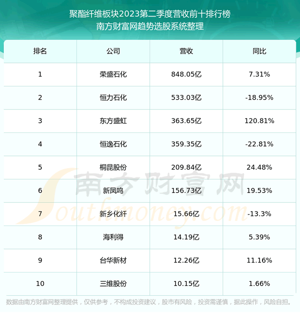 按照趋势选股系统统计,该股所属板块为聚酯纤维板块,该板块共有17只股票,三维股份2023第二季度营收在该板块中排名为第10名,该板块2023第二季度营收排名前十的股票如下表: