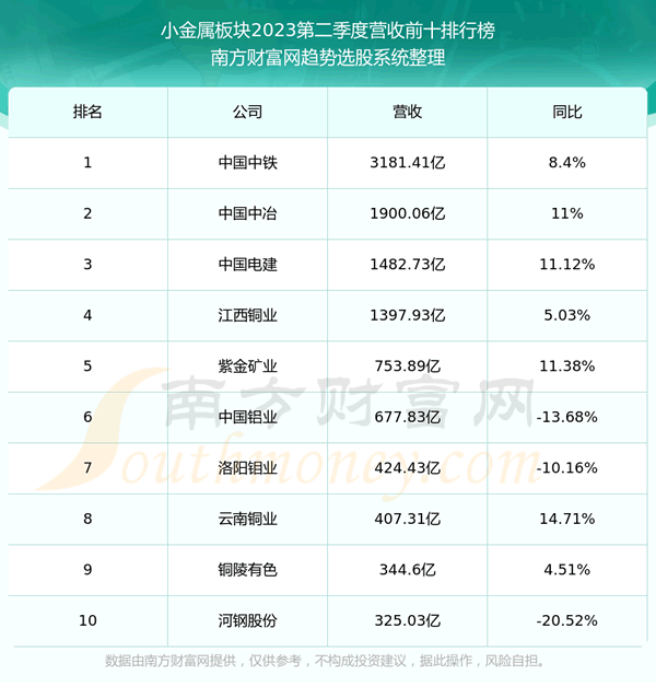 按照趋势选股系统统计,该股所属板块为小金属板块,该板块共有158只股票,吉翔股份2023第二季度营收在该板块中排名为第63名,该板块2023第二季度营收排名前十的股票如下表: