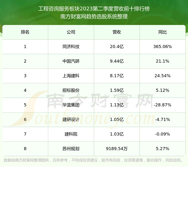 按照趋势选股系统统计,该股所属板块为工程咨询服务板块,该板块共有8只股票,上海建科2023第二季度营收在该板块中排名为第3名,该板块2023第二季度营收排名前十的股票如下表: