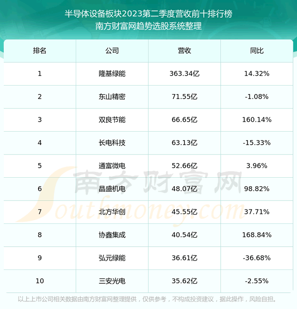 按照趋势选股系统统计,该股所属板块为半导体设备板块,该板块共有121只股票,芯源微2023第二季度营收在该板块中排名为第64名,该板块2023第二季度营收排名前十的股票如下表: