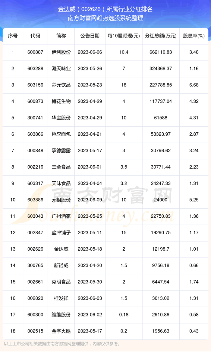 按照趋势选股系统统计,金达威所属行业为保健食品行业,保健食品行业分红排名情况如下表: