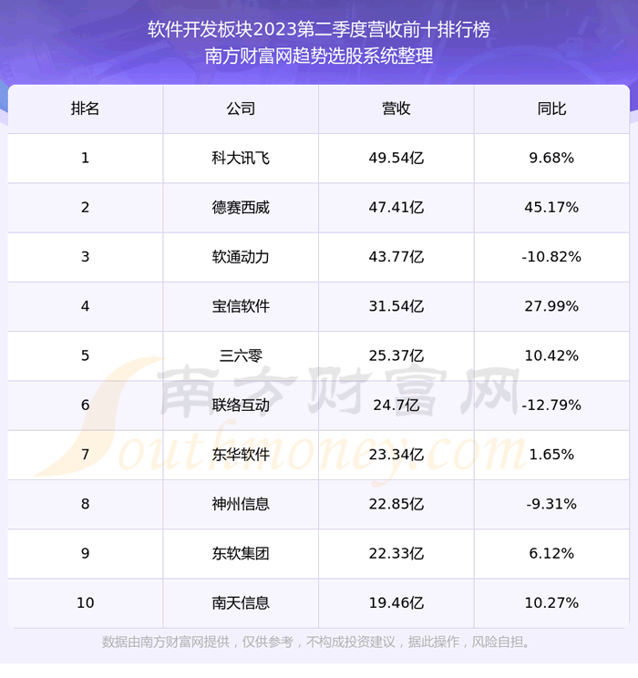 按照趋势选股系统统计,该股所属板块为软件开发板块,该板块共有192只股票,纬德信息2023第二季度营收在该板块中排名为第186名,该板块2023第二季度营收排名前十的股票如下表: