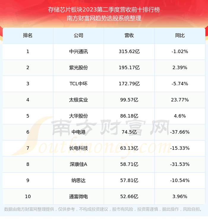 按照趋势选股系统统计,该股所属板块为存储芯片板块,该板块共有84只股票,聚辰股份2023第二季度营收在该板块中排名为第72名,该板块2023第二季度营收排名前十的股票如下表: